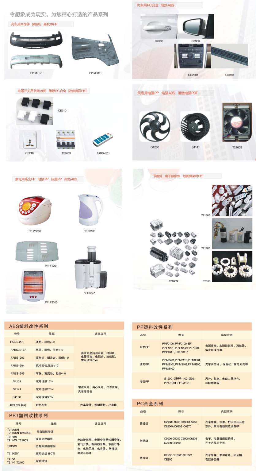 工程塑料廣泛應(yīng)用于汽車行業(yè)、電子電器行業(yè)、家電行業(yè)等各行業(yè)。精亮CHING LEUNG工程塑料中的PP阻燃、PP增強(qiáng)、高光PP、阻燃ABS、耐熱ABS、PC/ABS合金、增強(qiáng)PA等不同改性材料給您更多的選擇,使得您的想象成為現(xiàn)實(shí)。